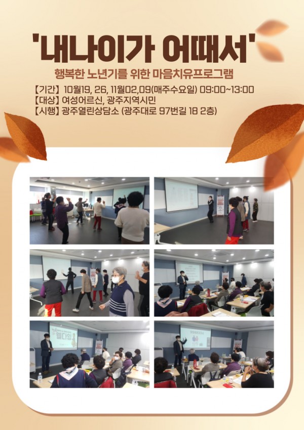 '내나이가 어때서' 행복한 노년기를 위한 마음치유프로그램 진행 2022년 11월 02일 페이지 정보 작성자 광주열린상담소 작성일22-12-14 09:54 조회1,031회 댓글0건 관련링크 이전글 다음글 목록 본문 1교시 : 라인댄스 2교시 : 웰다잉 댓글목록 등록된 댓글이 없습니다. 이전글 다음글 목록