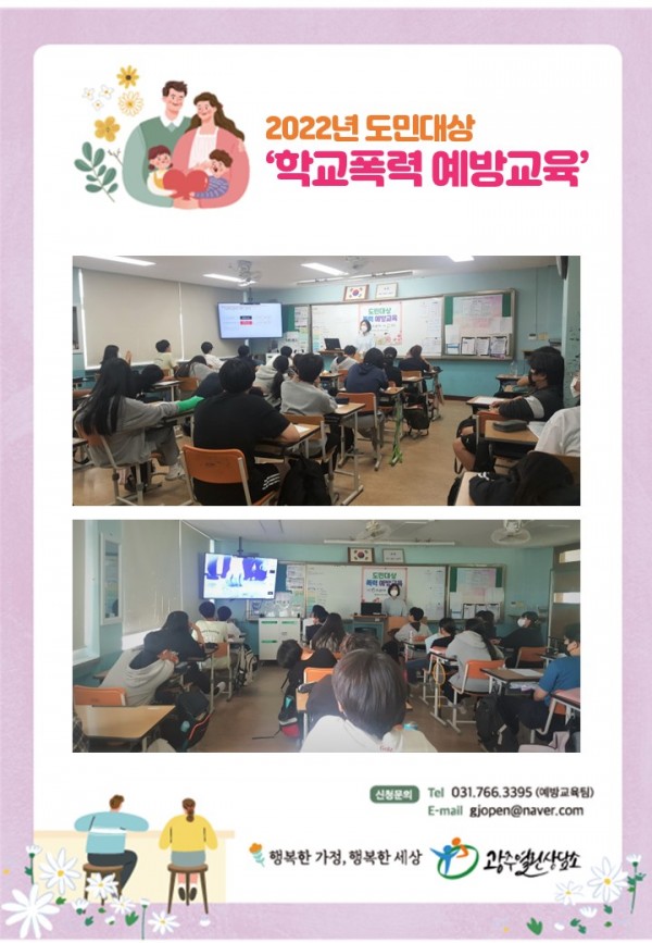 2022년 6월10일 광수중학교 학교폭력예방교육(2학년) 페이지 정보 작성자 광주열린상담소 작성일22-06-13 09:22 조회1,283회 댓글0건 관련링크 이전글 다음글 목록 본문 광주시 광수중학교 학교폭력예방교육을 실시하였습니다. 댓글목록 등록된 댓글이 없습니다. 이전글 다음글 목록