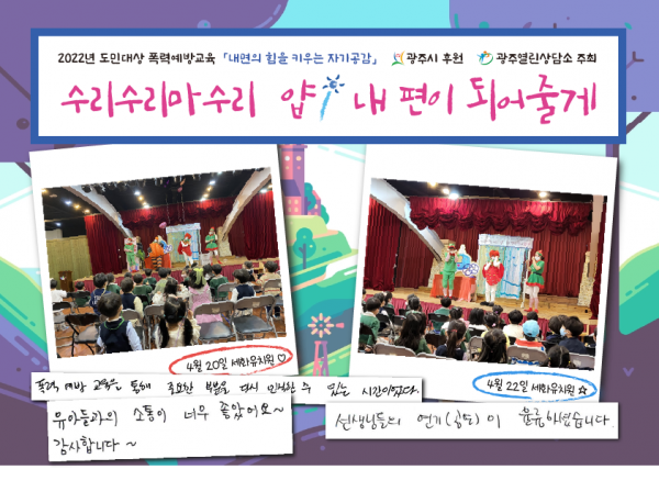 가정폭력 예방교육 뮤지컬 '수리수리마수리 얍! 내 편이 되어줄게' 공연을 하였습니다.