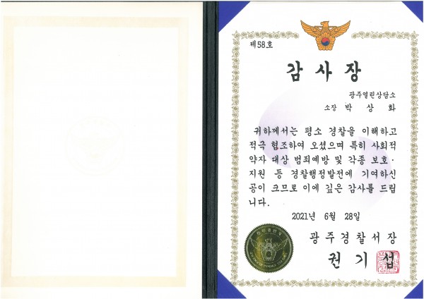 광주경찰서로부터 감사장을 받게 되었습니다.