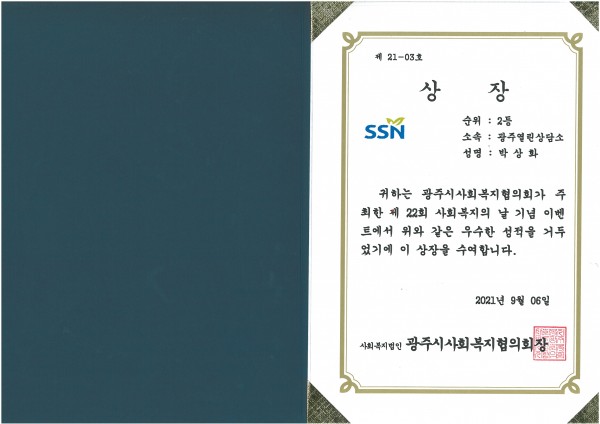 광주시사회복지협의회로부터 이에 대한 수상을 하였습니다.