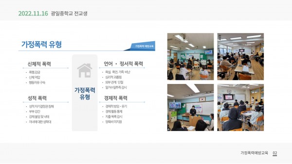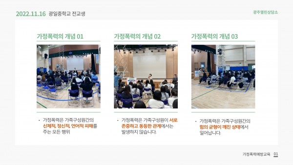 경기도민대상 가정폭력예방교육 11월16일 광일중학교 페이지 정보 작성자 광주열린상담소 작성일22-12-14 10:52 조회1,274회 댓글0건 관련링크 이전글 다음글 목록 본문 .. 댓글목록 등록된 댓글이 없습니다. 이전글 다음글 목록