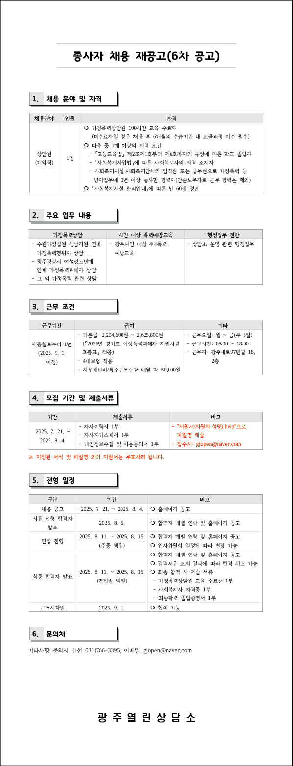 [공고] 종사자(상담원) 채용 6차 공고