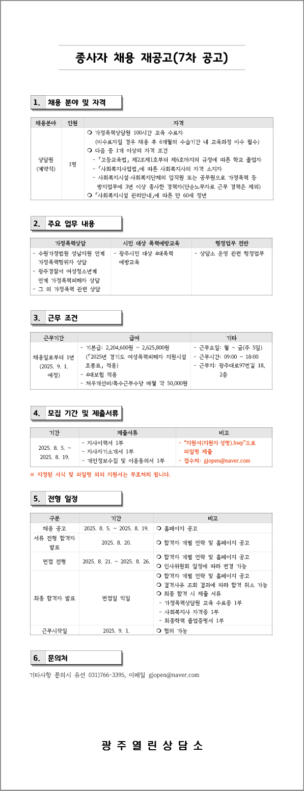 [공고] 종사자(상담원) 채용 7차 공고